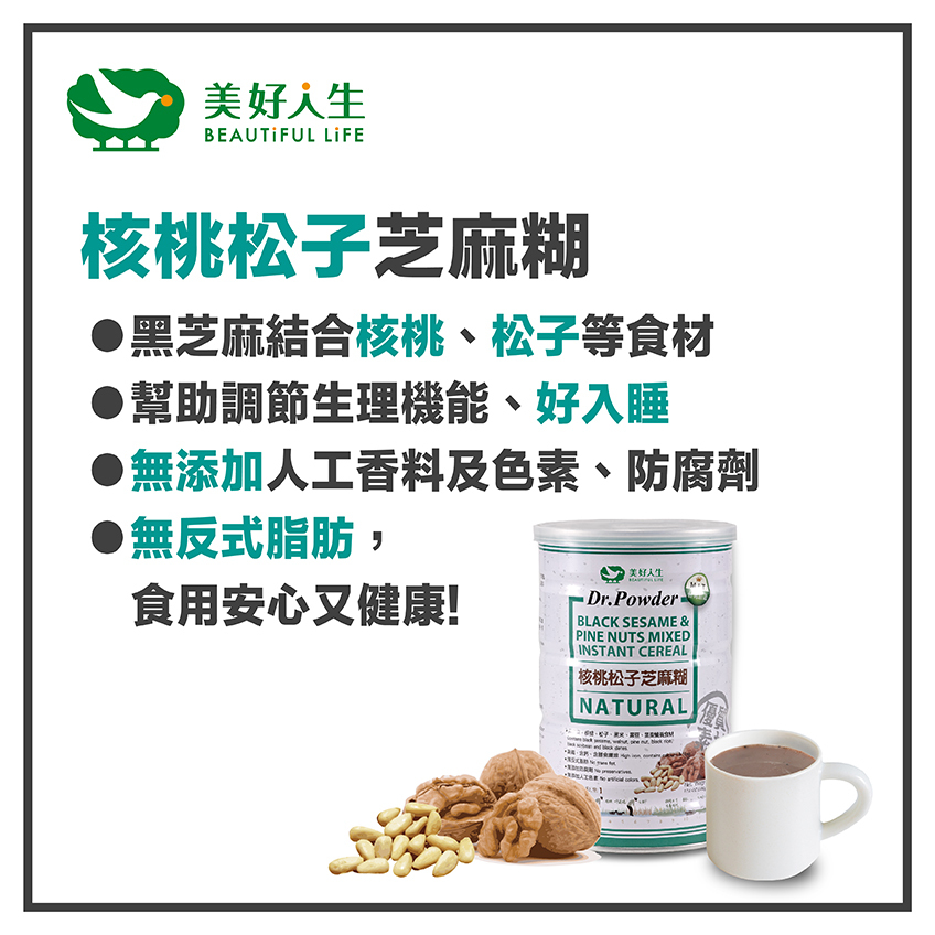 本產品含黑芝麻、小麥、大豆、松子、核桃及奶類製品可能導致過敏症狀;本產品生產製程廠房,其設備或生產管線有處理堅果種子類、花生、含有麩質的穀類及其製品