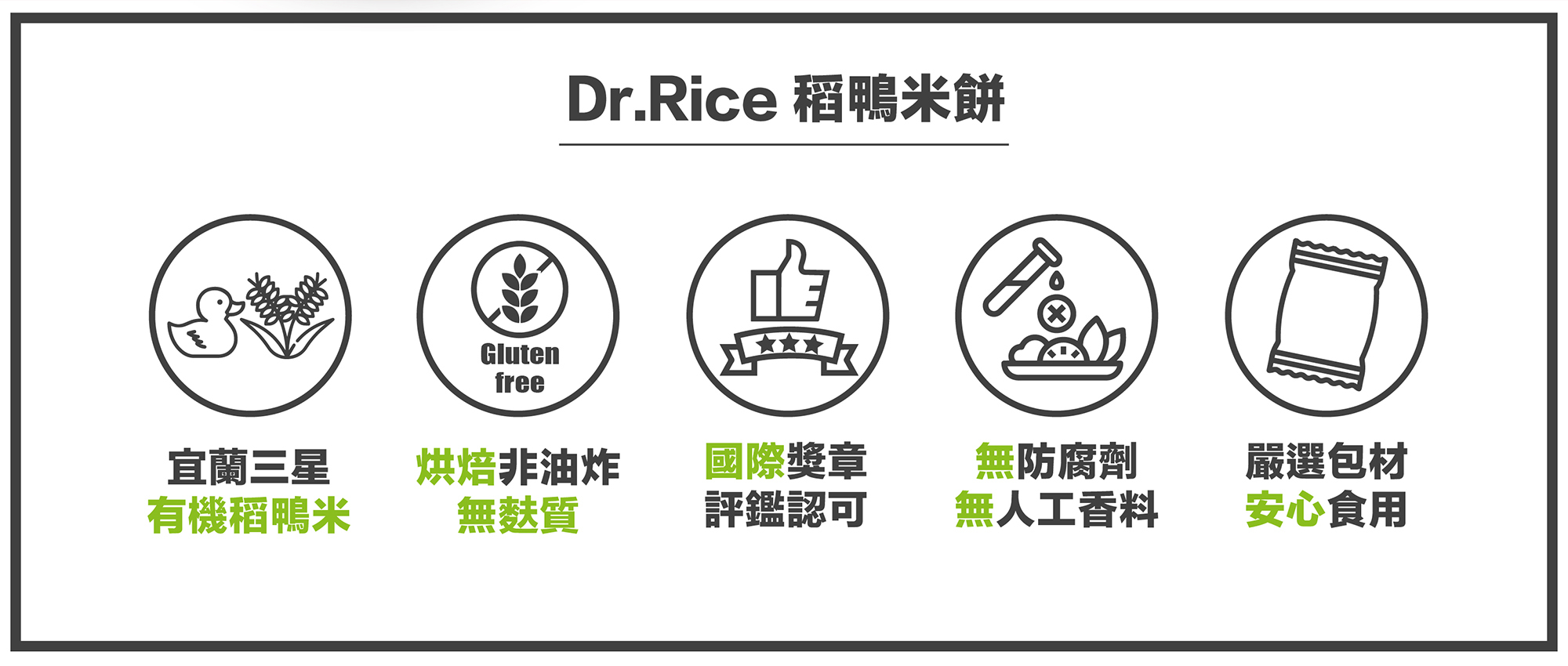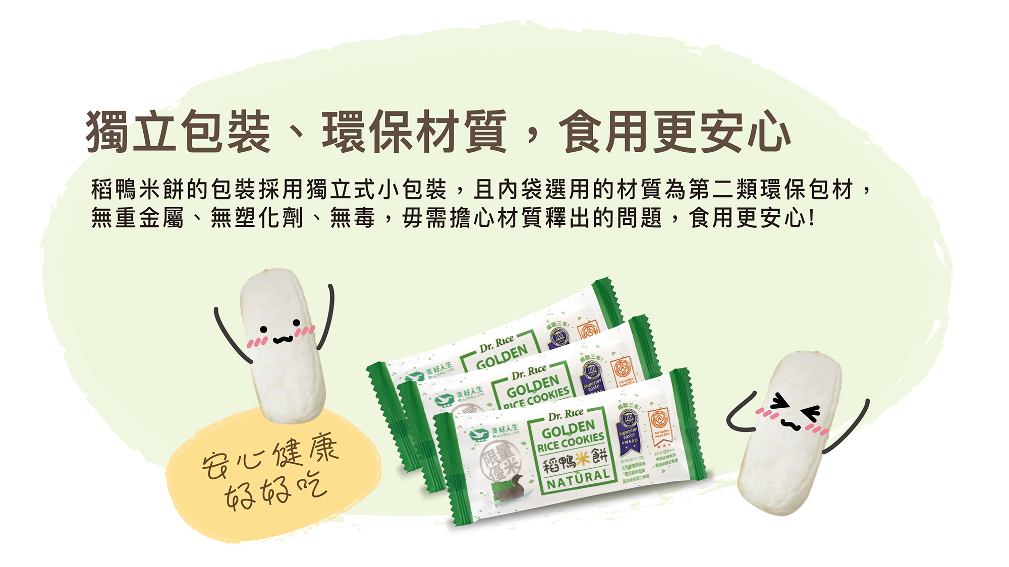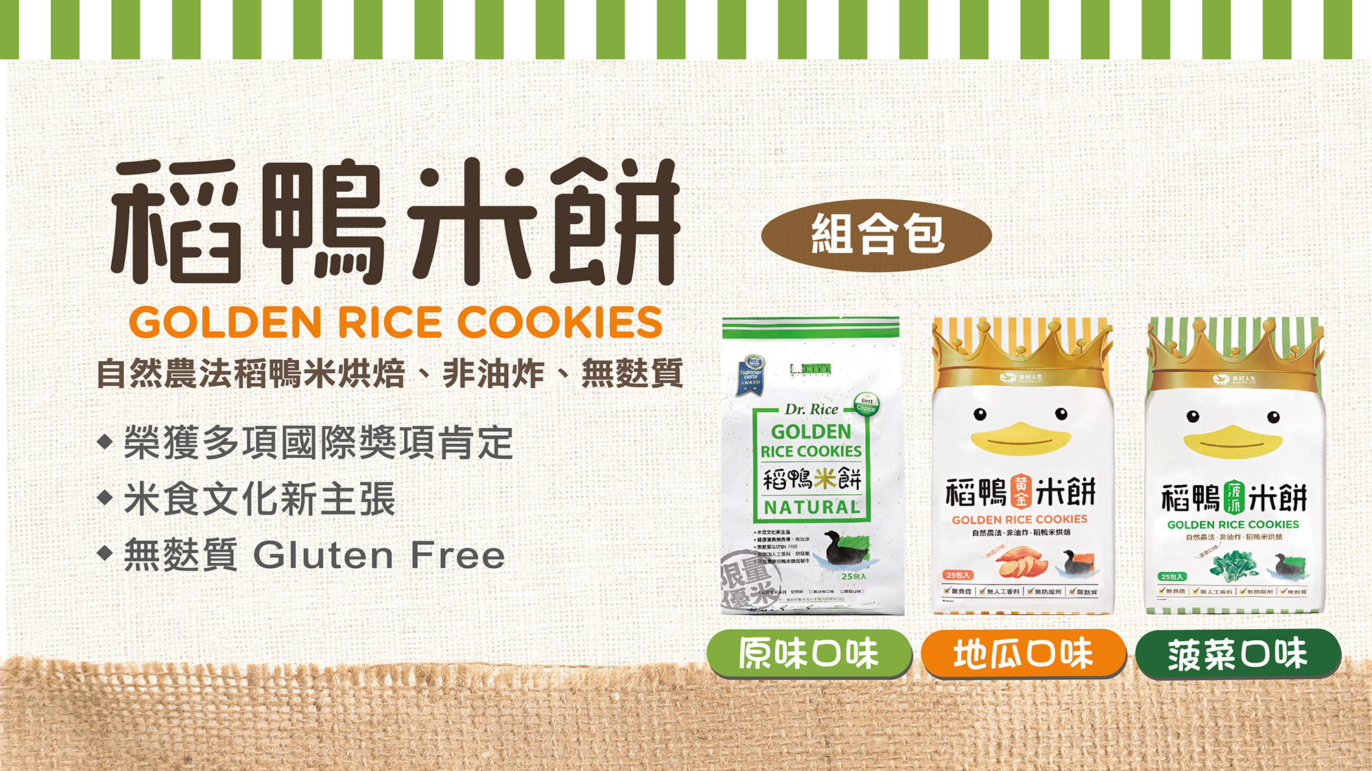 稻鴨米餅全系列商品(經典/有機原味、地瓜、菠菜口味)為米製品,適用於孩童、成人、長輩皆可食用。