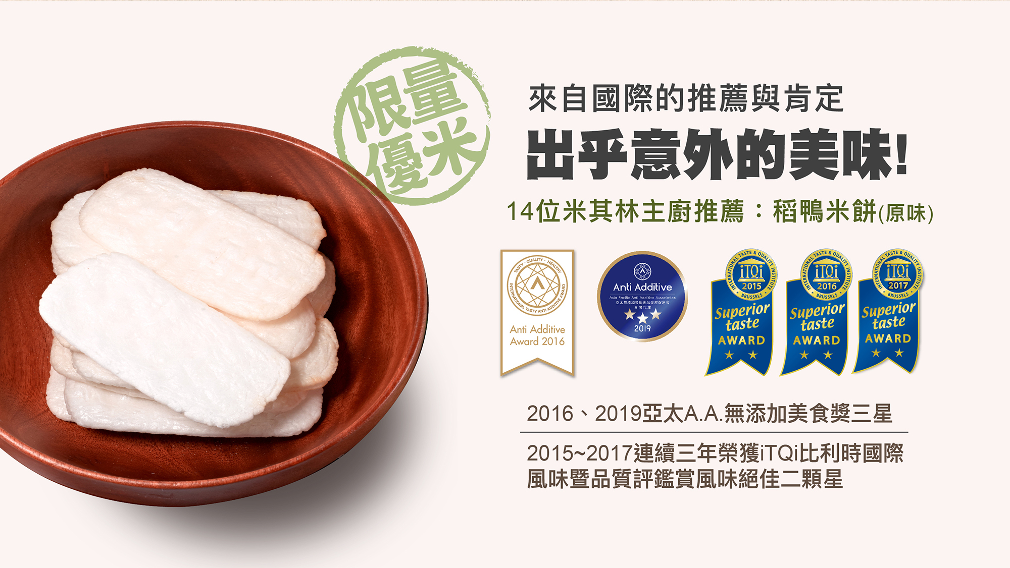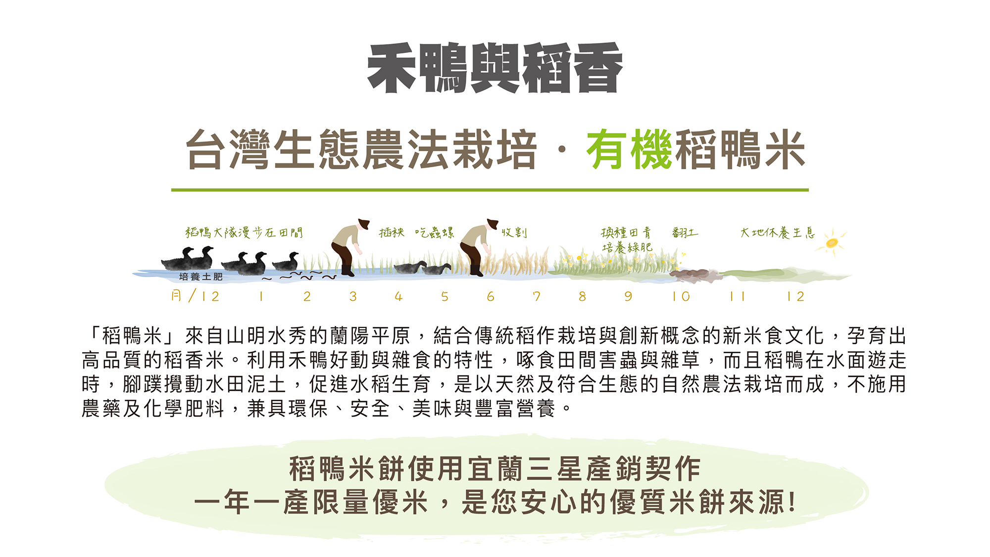 稻鴨米餅使用宜蘭三星產銷契作、一年一產限量優米,是您安心的優質米餅來源!