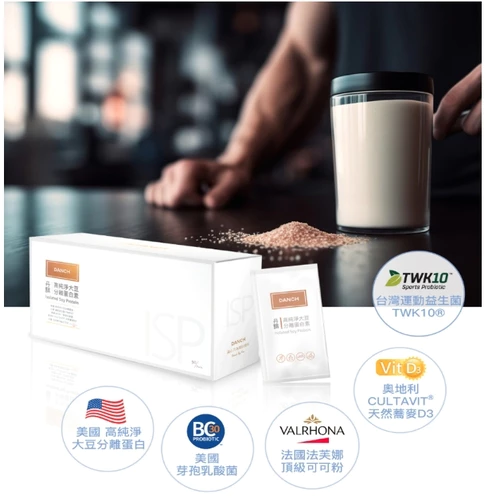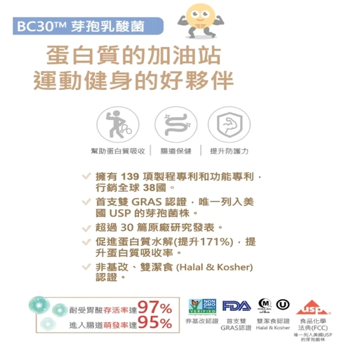 主成分:美國非基因改造大豆分離蛋白(純度90%以上)、BC30芽孢乳酸菌、運動益生菌(TWK-10® 植物乳桿菌)、天然蕎麥純素維生素D3
