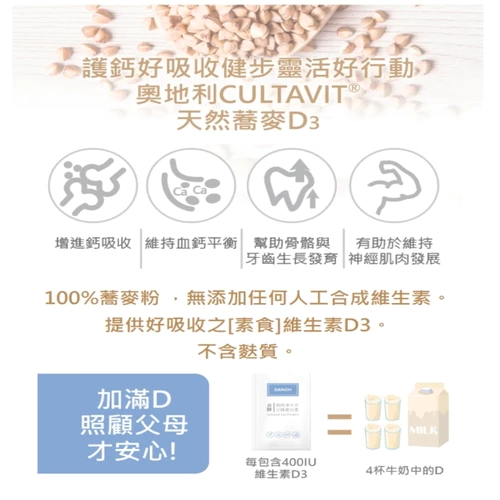 V 400 IU的天然蕎麥維生素D3,護鈣好吸收、健步靈活好行動