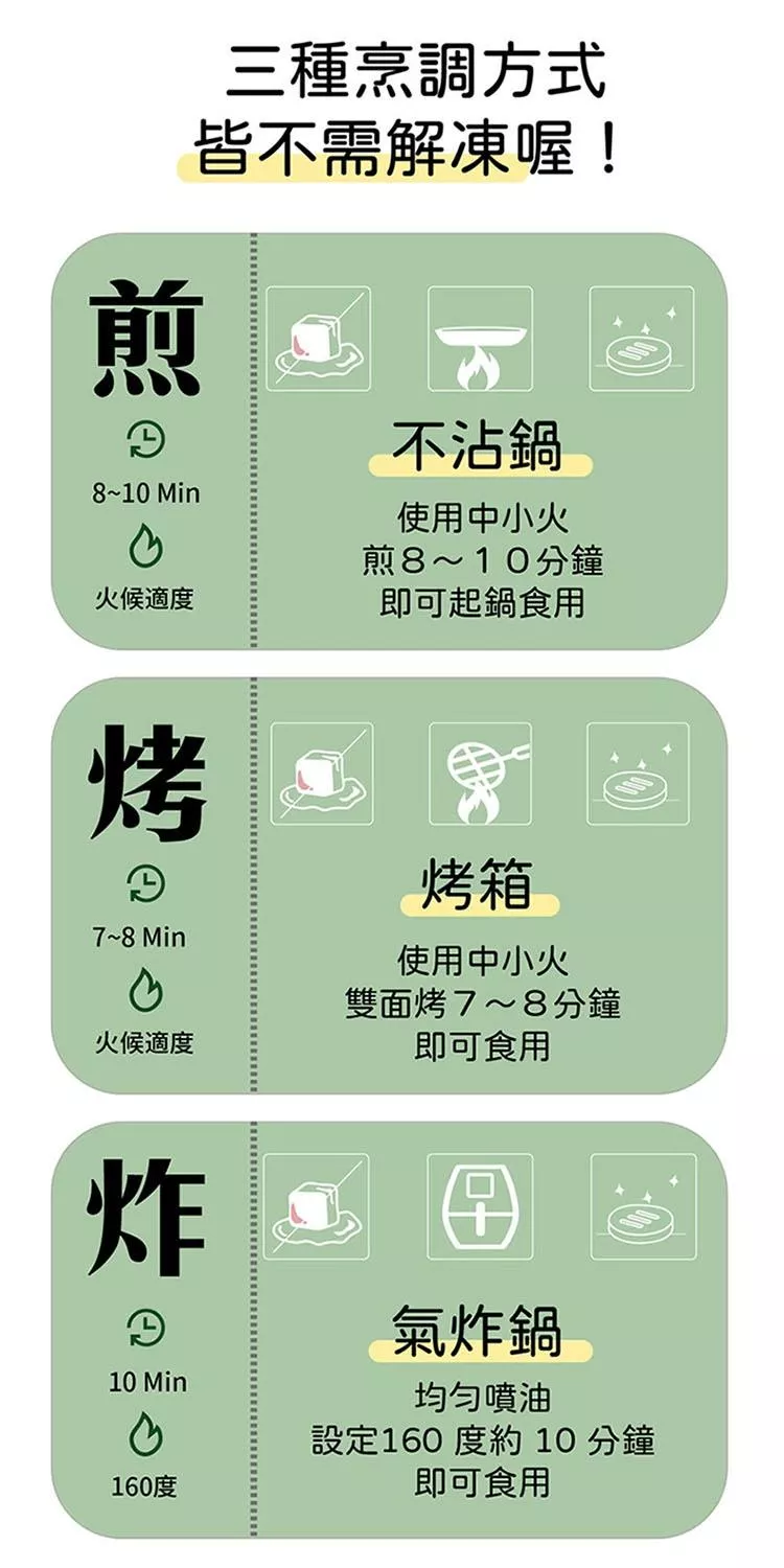 ◎調理方便簡單容易,小火慢煎或燒烤方式,無須 加一滴油。