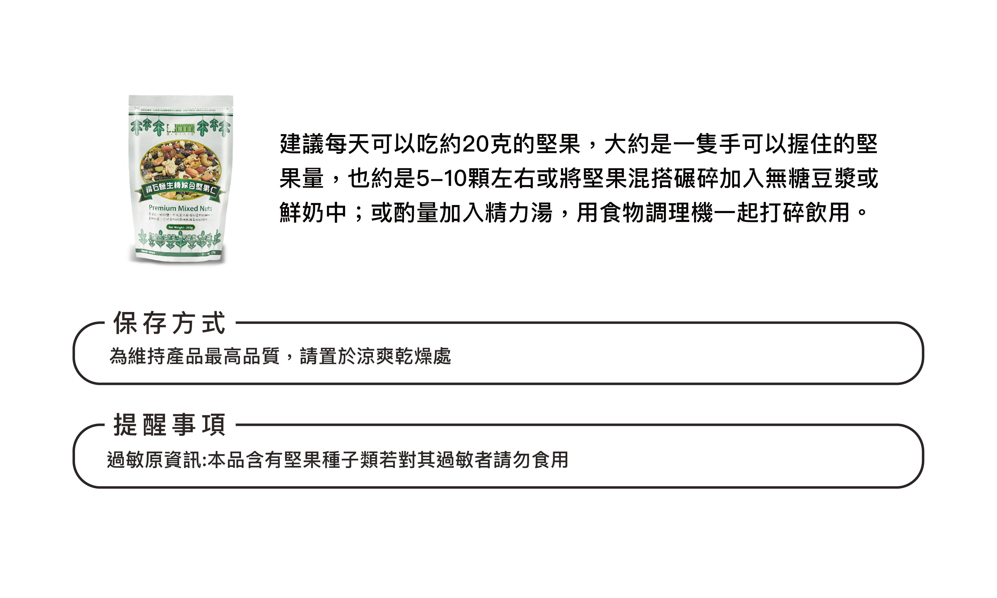 | 其他應注意事項 | 過敏原資訊:本品含有堅果種子類若對其過敏者請勿食用 |