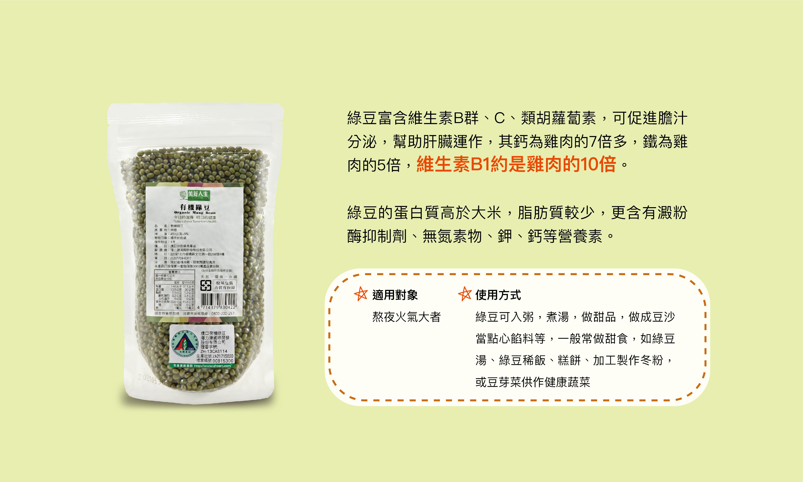 一般常做甜食,如綠豆湯、綠豆稀飯、糕餅、加工製作冬粉,或豆芽菜供作健康蔬菜